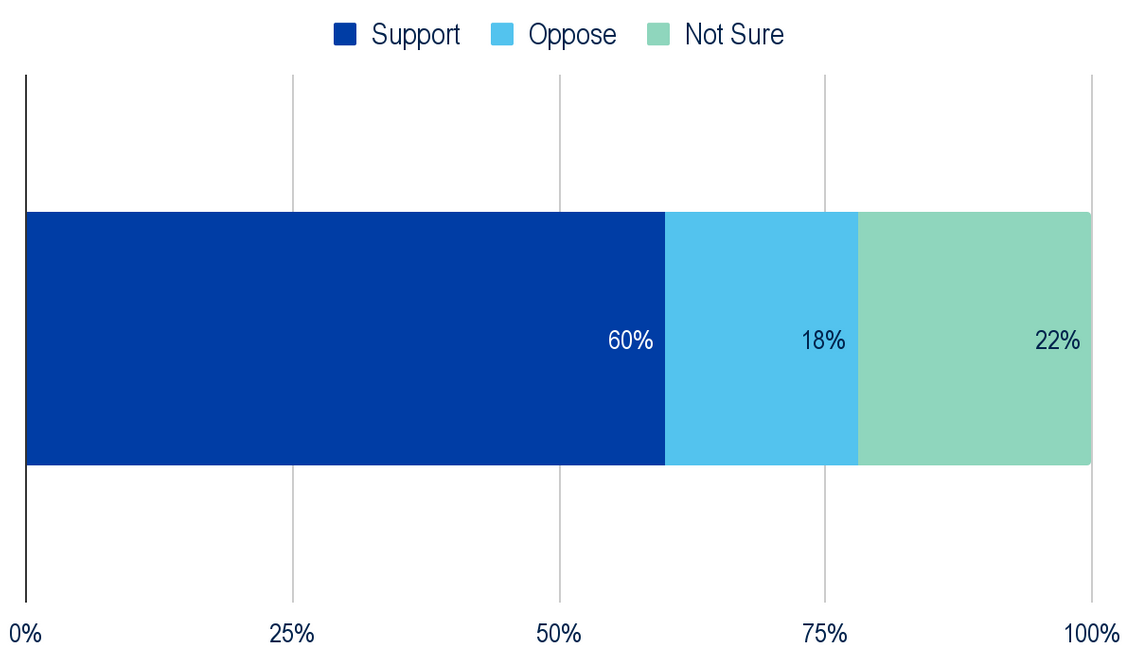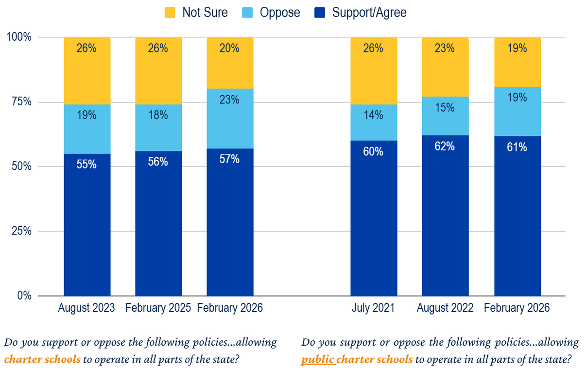 Senate Bill 727, which passed in 2024, allows charter schools to operate in St. Louis City, Kansas City, and Boone County. Interestingly, 61% of likely voters supported public charter schools operating in all parts of the state. All charter schools are public schools that are privately governed by an appointed board. In prior polling, six out of ten Missouri likely voters believed that charter schools are private.