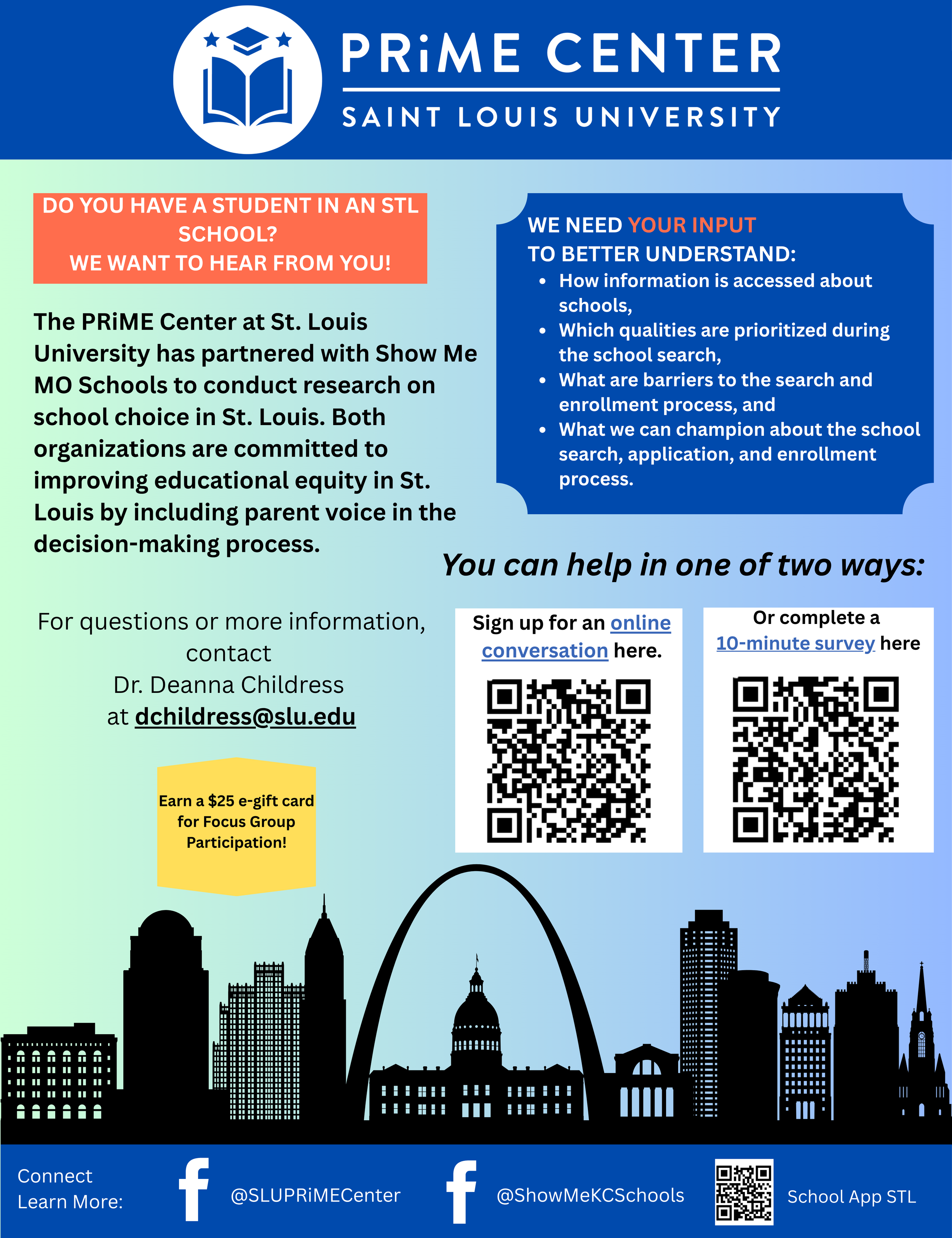 The PRiME Center at Saint Louis University is partnering with Show Me MO Schools to better understand how families in St. Louis navigate school choice. We believe that caregiver voices—like yours—are essential in shaping policies that reflect real family experiences, needs, and dreams.